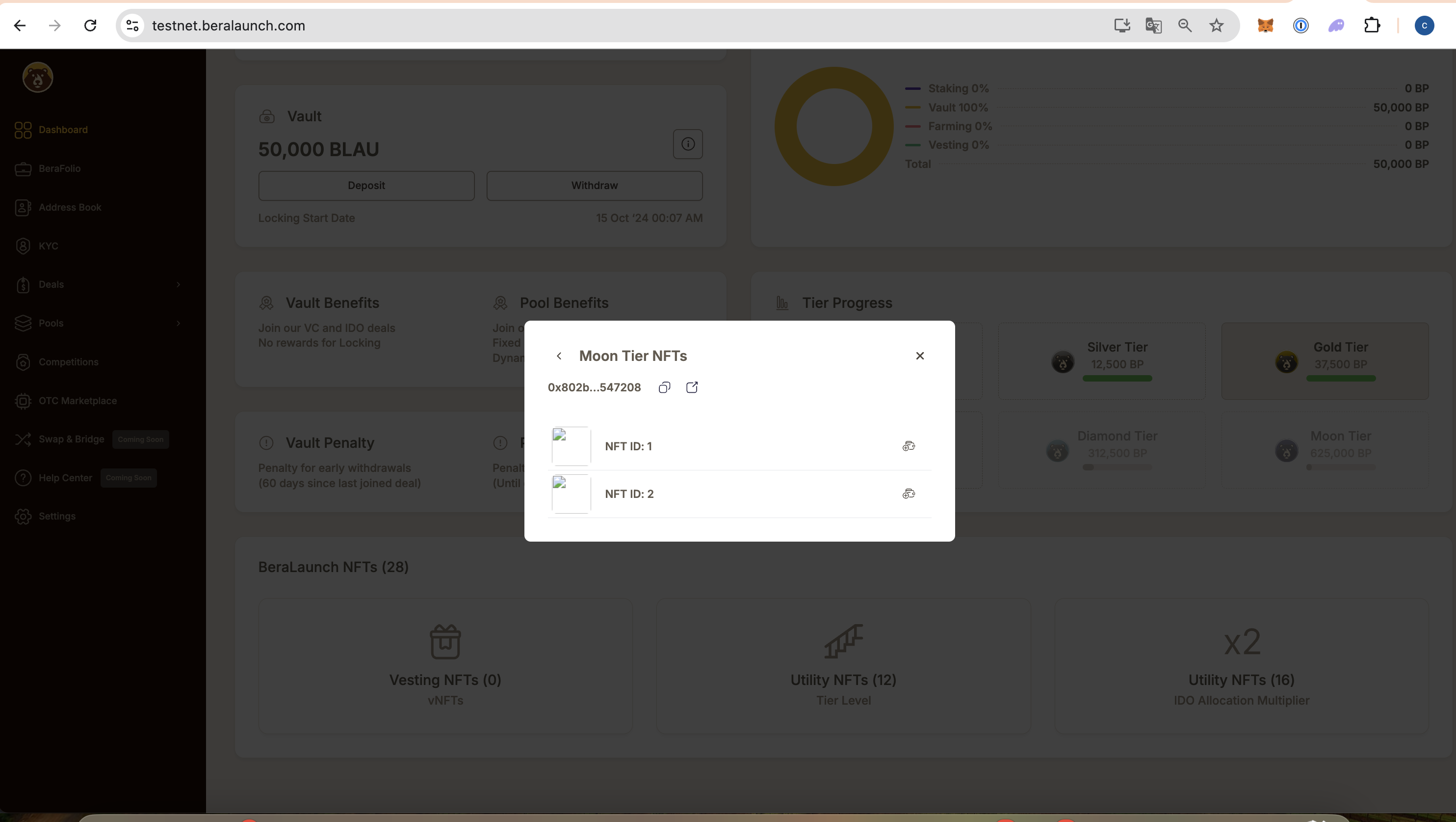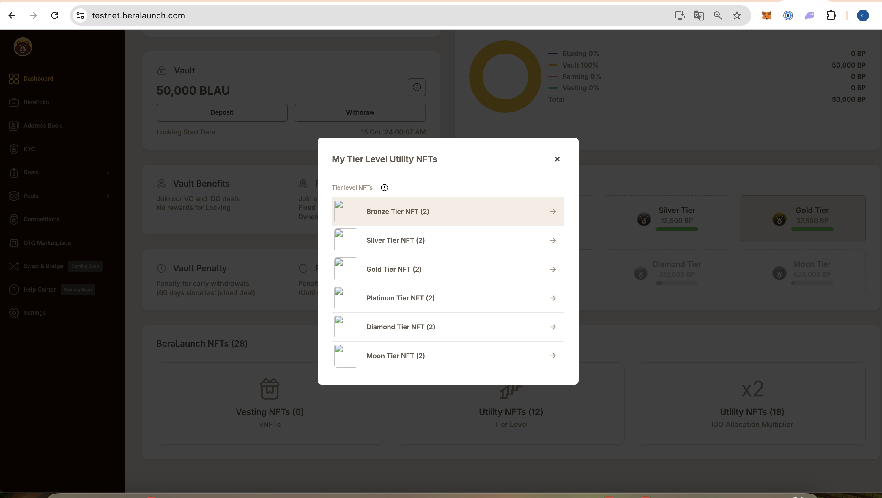 <figure><img src="https://3603209284-files.gitbook.io/~/files/v0/b/gitbook-x-prod.appspot.com/o/spaces%2FP0CoSX9ULnjIIfGpNUXa%2Fuploads%2Fe3D6mTIHfEIeXqZIUAHl%2Fimage.png?alt=media&#x26;token=b4b99f8b-b2f4-47e0-baf6-619f255037d4" alt=""><figcaption><p>Tier level NFTs: I see the Tier levels and the amount of such NFTs I hold.</p></figcaption></figure>