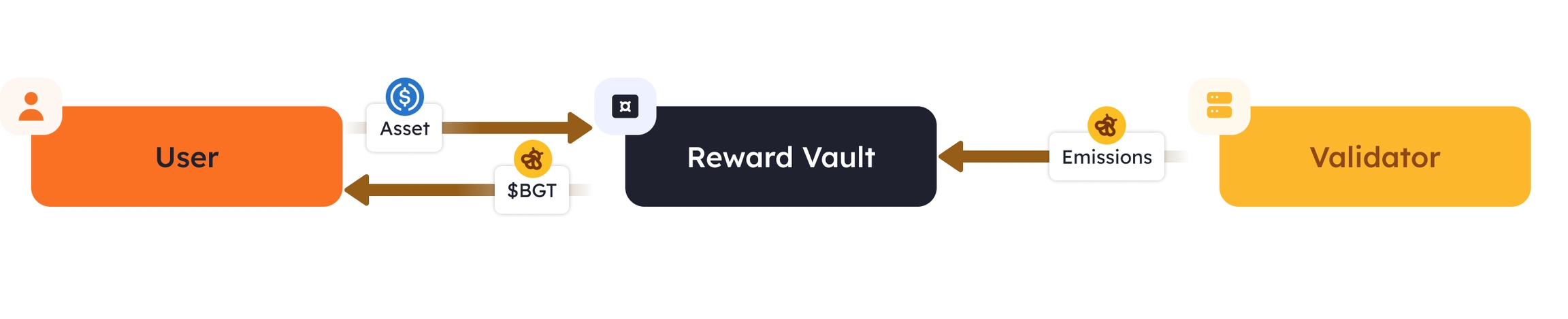 Reward vaults are smart contracts in which users can stake their Proof of Liquidity (PoL) eligible assets in order to receive $BGT